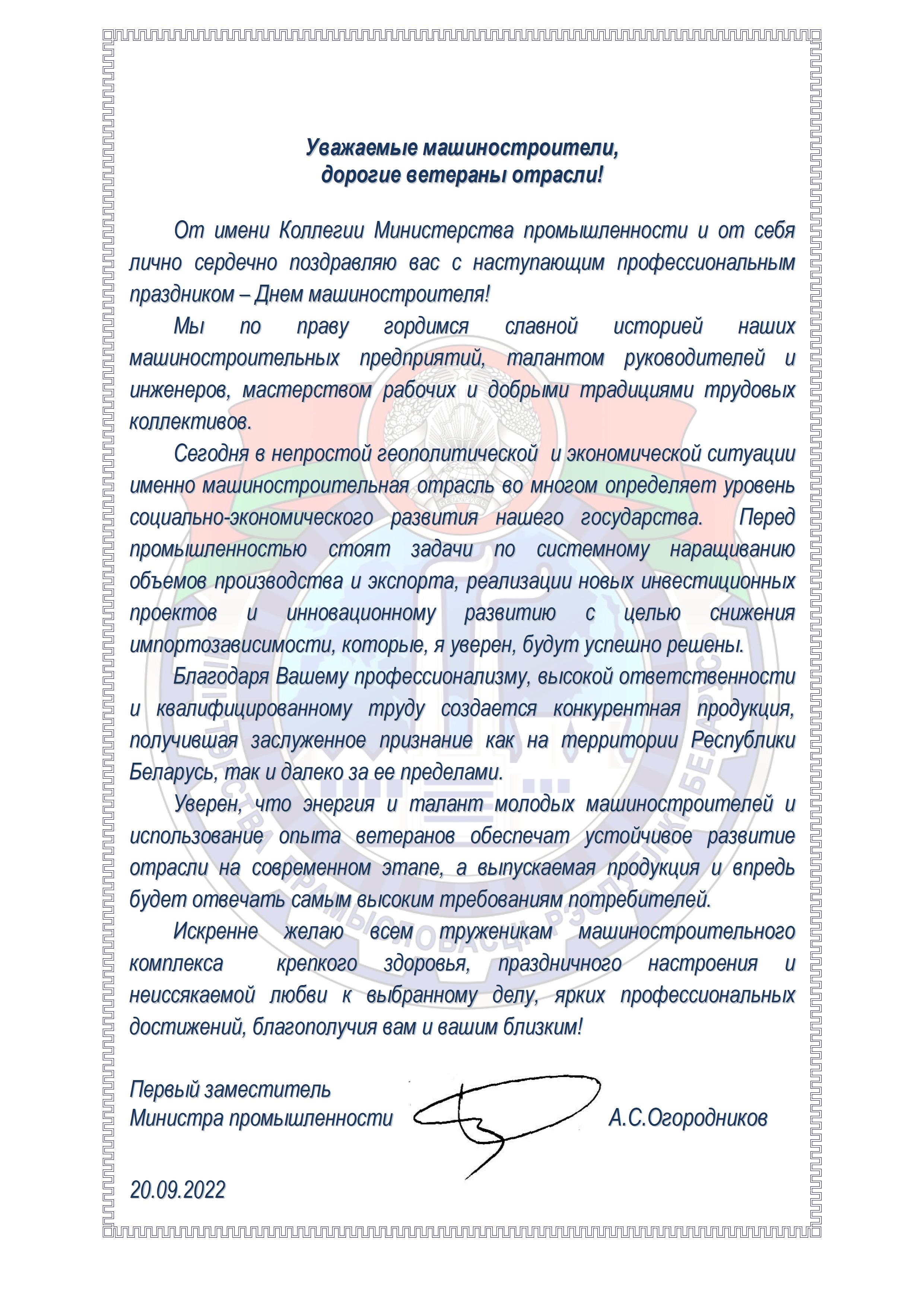 Поздравительный адрес ко Дню машиностроителя от имени Первого заместителя Министра промышленности