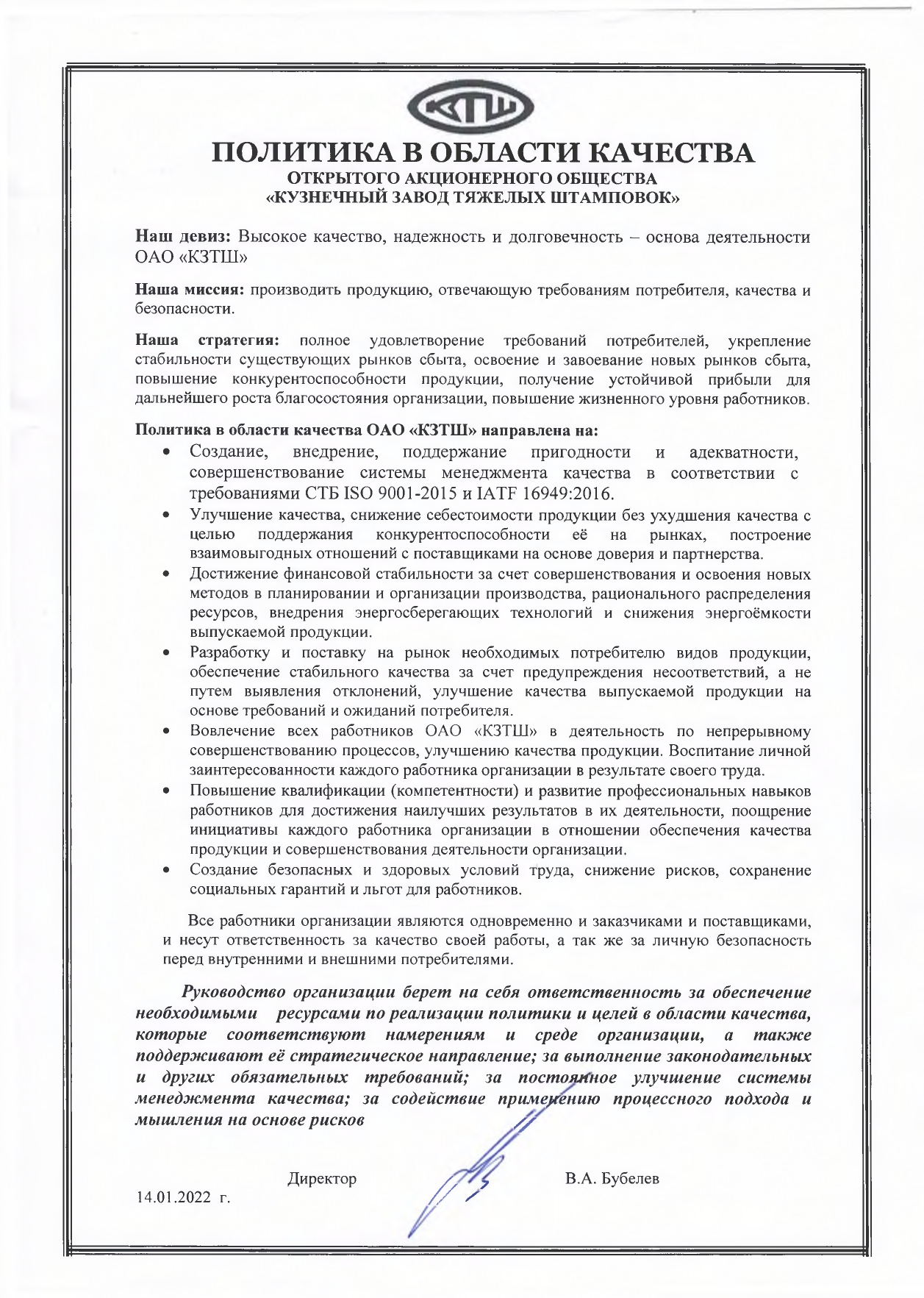 Руководство по качеству для поставщиков ОАО "КЗТШ"